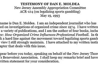 Here is the complete text of my testimony about the dangers of sports gambling and game fixing in the NFL