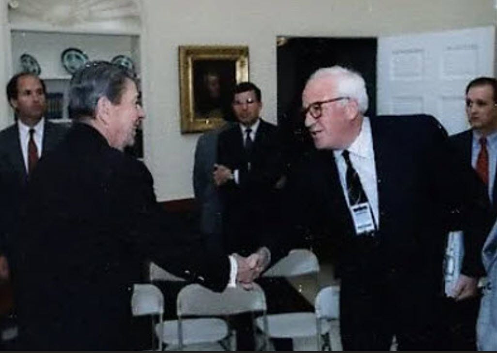 Above is a photograph of historian Godfrey Hodgson shaking hands with President Ronald Reagan.